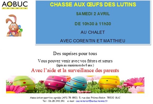 Chasse aux œufs de pâques lutins Bonjour à tous, Les enfants des cours "lutins" du samedi et mercredi matin sont conviés à venir le samedi 4 avril pour la traditionnelle chasse aux œufs du club : À bientôt, Le secrétariat